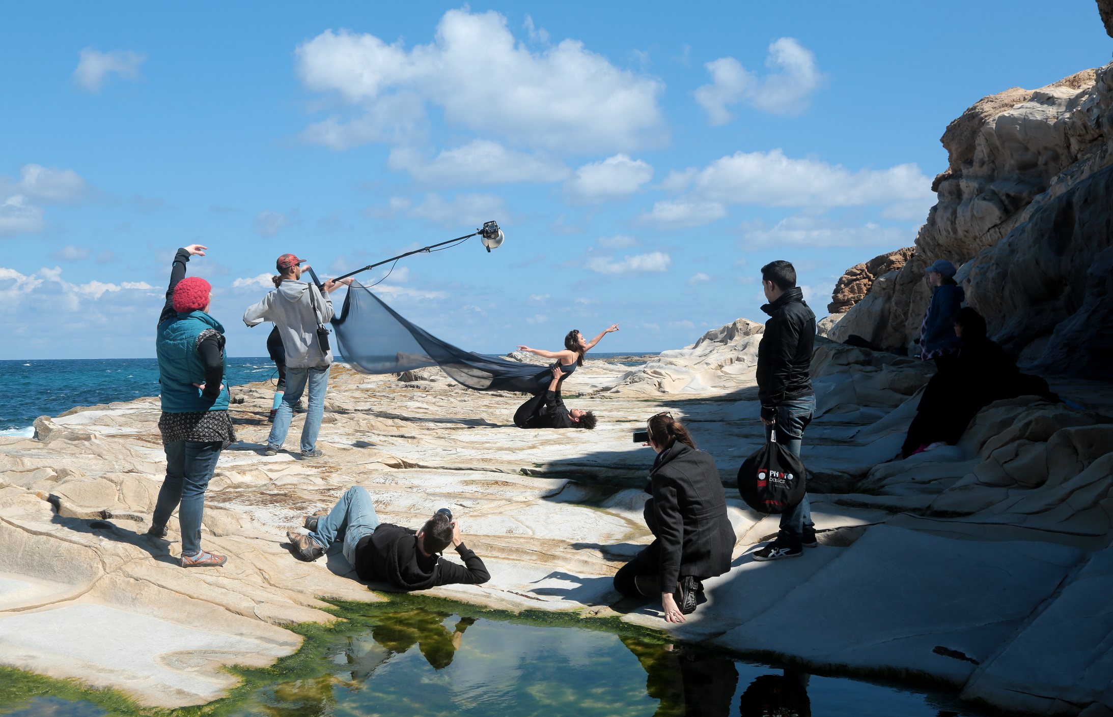 Arriving at the location (after about one hour in the car) I noticed that the conditions were nothing like the day before. The light breeze from yesterday had become a force to be reckoned with as it thrashed the waves against the rock, which meant this shoot just got much more interesting. By the time we got to the first small cliff, the dancers and my crew were looking at me like I was a bit nuts. One by one we went down the ladder and passed all the bags of gear and wardrobe down from person to person until finally we were all safely at the shooting site. No injuries, no panic attacks, and everyone was even more excited than before for the shooting to begin.